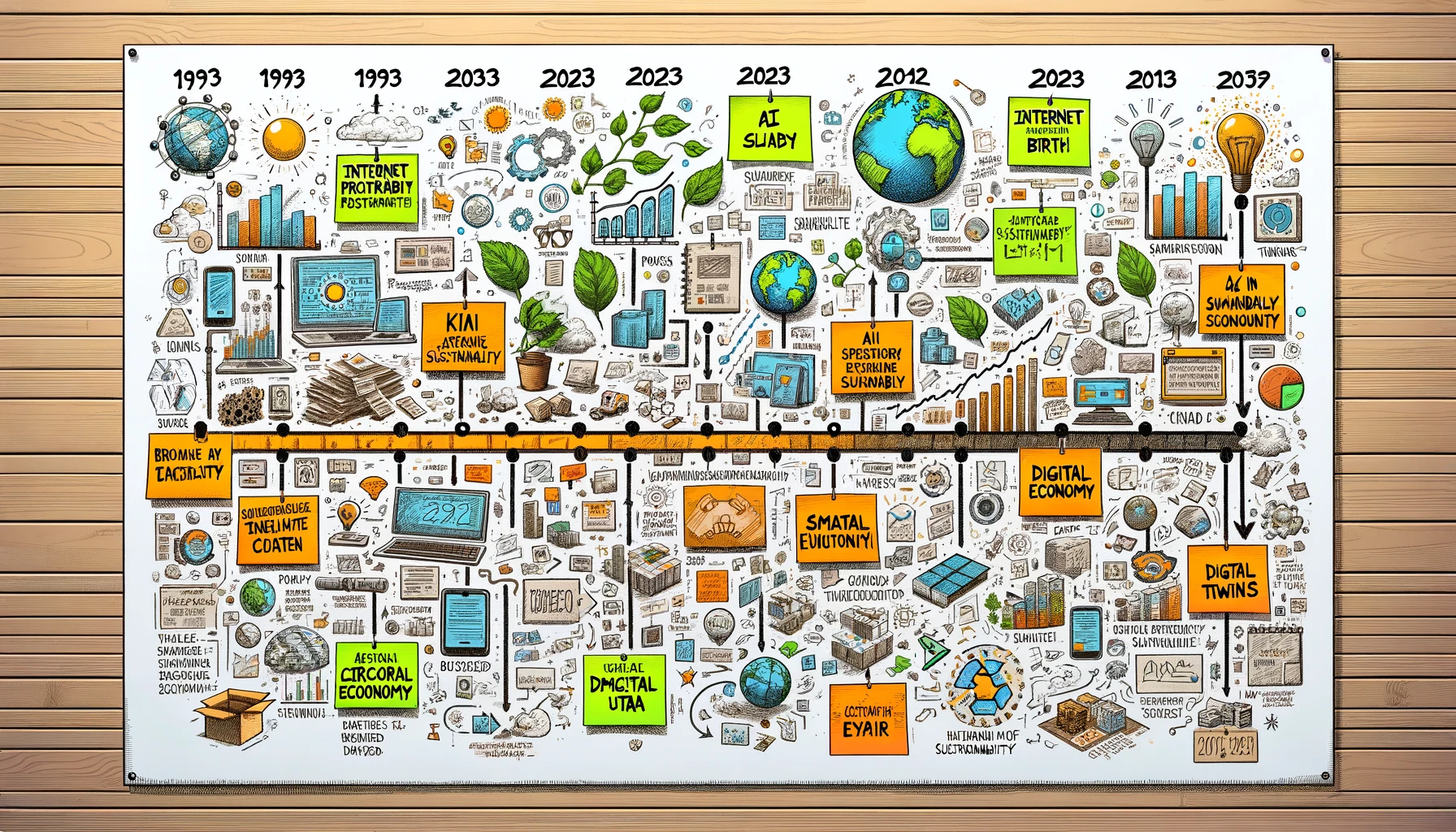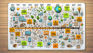 DALL·E 2023-12-02 20.39.50 – Create an illustration of a timeline on a whiteboard filled with sticky notes, sketches, and handwritten annotations. The timeline starts from the lef